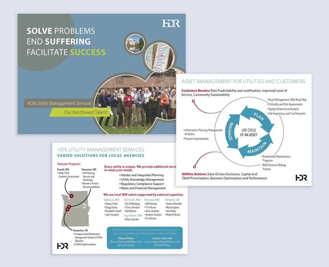 With over 200 offices worldwide, HDR Engineering is an industry leader, specializing in civil engineering, environmental and construction services. As a member of their Seattle-based marketing team, I designed materials for proposals, project planning efforts and various client events. Projects required extensive collaboration with technical staff to ensure data and concepts were accurately represented. I also worked with an on-site print services provider to ensure production was to-spec.